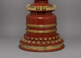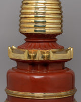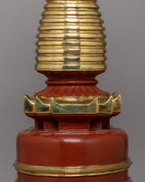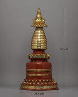 This Tibetan Buddhist Stupa for Meditation is a stunning handcrafted sacred shrine that symbolizes enlightenment, harmony, and spiritual blessings. Standing 62 cm tall and 28.5 cm wide, this copper body stupa has been adorned with gold-plated accents representing divine energy and serenity. The stupa, often found in Buddhist temples and meditation rooms, represents the path to enlightenment and is a significant central attraction for spiritual growth and dedication.