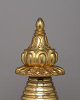 The stupa weighs 9.22 kg and has a tiered construction with rich artistry reflecting Buddhist teachings' symbolism. Its gold-plated layers and incredible design elevate it beyond mere decoration, transforming it into a sacred instrument for mindfulness practices, meditation, and ceremonial offerings. It improves the atmosphere of any altar, home shrine, or meditation area, enhancing your connection to spiritual activities and fostering tranquility, balance, and clarity.