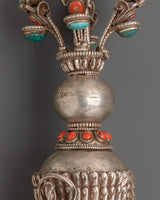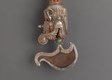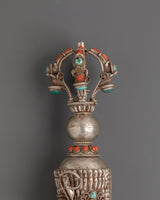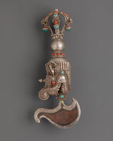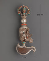 This classic Buddhist ceremonial knife is essential for esoteric tantric activities, particularly those involving wrathful deities and guardian rites. The Kartika, which represents the severing of evil forces, is frequently combined with a vajra (thunderbolt) in religious ceremonies. Its elaborate craftsmanship, accented by brilliant turquoise and coral accents, gives not just visual richness but also profound spiritual significance. The use of fake stones assures long-lasting color and beauty while honoring traditional aesthetics, making it a symbolic and ornamental masterpiece.
