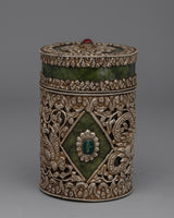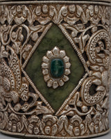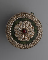 The box is further embellished with finely carved jade stones set into the silver front. The jade gives the silver a striking contrast, enhancing the box's aesthetic appeal and cultural relevance. The fine craftsmanship and meticulous attention to detail characteristic of Tibetan ornamental arts are exemplified by this inlay work. The Tibetan Circular Box is a beautiful ornamental piece in addition to a useful storage container. It adds value to any collection and adds a touch of sophisticated culture to any area thanks to its creative design and traditional material blend.