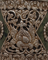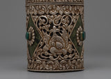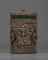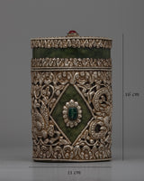 The Tibetan Circular Box is a stunning piece of handcrafted jewelry 16 cm tall and skillfully made of pure silver. This ornamental piece combines fine silver with intricate craftsmanship and displays remarkable Tibetan artistry. The box looks more opulent and sophisticated because of the use of pure silver, which also increases its durability. Because this box is carefully handmade using traditional methods, it is a one-of-a-kind expression of Tibetan heritage.