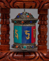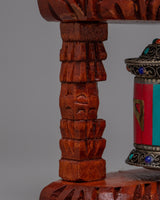 The Tibetan Copper Prayer Wheel is an intriguing fusion of age-old artistry and metaphysical meaning. Crafted by hand from copper and brass, and supported by a solid wooden frame, its design exemplifies the classic Tibetan style. The wheel is adorned with finely inlaid coral, turquoise, lapis lazuli, and turquoise stones. Each gemstone has a symbolic significance that lends the wheel both aesthetic appeal and spiritual depth.