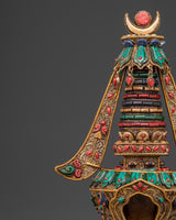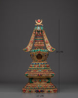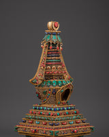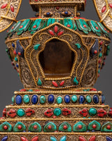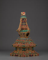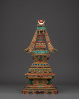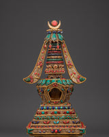 This stupa, expertly crafted from crystal, is complemented by gold-plated copper and delicate filigree work, as well as symbolic coral and turquoise stones, all of which have deep roots in Tibetan ceremonial arts. Each detail displays devotion and exceptional craftsmanship, making it an important addition to any Buddhist shrine or meditative setting. The stupa's structure promotes clarity, stability, and harmony, acting as a light of compassion and mindfulness.