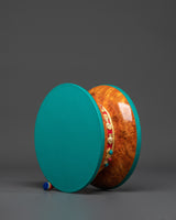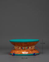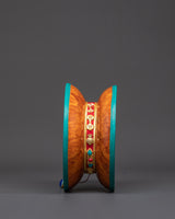 Handcrafted from Bhutanese wood, this piece features a copper body adorned with gold-plated artificial coral and turquoise stones, adding both beauty and spiritual significance. It weighs 0.97 kilograms and stands 12 centimeters tall and 25.9 centimeters broad. The protective cover adds 0.52 kilograms to the total weight.