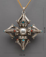 Step into the realm of mystique with the Tibetan Double Vajra Locket, skillfully handcrafted on a gleaming silver body. This enchanting locket features the iconic Double Vajra symbol, a representation of supreme spiritual power and indestructibility in Tibetan Buddhism. Intricately designed, the locket showcases small stones artfully inlaid, adding a touch of sparkle and elegance.
