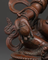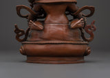 The Tibetan Dzambhala Statue with Consort is a stunning work of Tibetan Buddhist art depicting the mighty deity of wealth and prosperity. This statue is expertly fashioned from oxidized copper and includes rich details that bring Dzambhala and his consort to life. This piece of art is ideal for meditation areas or as a centerpiece for an altar. With its rich symbolism and brilliant craftsmanship, it welcomes success and abundance into your life.