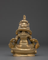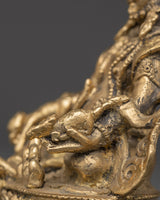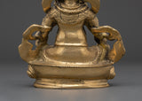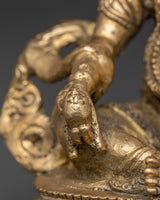 This statue, skillfully cast in brass, stands 15 cm tall, 12 cm wide, and weighs 0.62 kg. Dzambhala is depicted in a royal seated position, holding a mongoose spewing jewels, which represents unending generosity. Every detail, from the facial expression to the lotus base, demonstrates meticulous craftsmanship and a dedication to excellence. A meaningful addition to meditation, rituals, or as a spiritual gift.