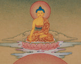 His golden body represents compassion and God's ability to grant material and spiritual wealth. He wears a five-jeweled crown that symbolizes the five wisdoms, with silk garments accentuating his divine status. An utpala garland signifies purity, while his right-hand holds a citron fruit for fortune, and his left-hand grips a mongoose spitting jewels, representing infinite wealth. The conch shell and vase beneath him symbolize the continuous flow of rewards. Above Dzambhala, Ratnasambhava Buddha sits on a lotus base, symbolizing the Buddha's calmness and kindness. His blessings radiate from the lotus, a symbol of spiritual purity and enlightenment. This sacred Dzambhala thangka is not only a source of benefits but also a stunning visual creation that fosters kindness and inner growth.