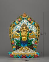 This beautifully designed wall hanging stands 32.5 cm tall and 22.5 cm wide, with golden wings, angry facial expressions, and a vibrant backdrop covered with floral and snake designs. The acrylic-painted details add to its spiritual shine, making it a beautiful decor piece and a religious artifact. This Garuda wall hanging has significant cultural and spiritual importance as a symbol of protection, a meditation tool, or an individual spiritual present.