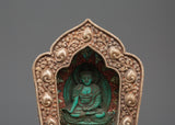 This exquisite Tibetan Ghau Box features a beautifully crafted Buddha sculpture, designed to house sacred relics. The box is made from copper and finished with silver plating, creating an elegant appearance. At the center, a finely detailed Buddha figure sits in a tranquil pose, embodying the essence of peace, enlightenment, and spiritual serenity. The design captures the spirit of Tibetan Buddhist art with intricate carvings and symbolic motifs that highlight the rich cultural heritage of the region.