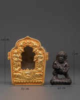 The Ghau box, crafted from copper and gilded with 24K gold, showcases intricate embossing with two standing figures on either side of the shrine window. It is 9.5 cm high and 8.5 cm wide, with an included oxidized copper deity statue standing 7 cm tall. The contrast between the luminous gold and the dark oxidized figure creates a powerful spiritual presence that enhances any altar or practice area.