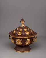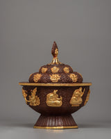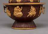 This burner is 36 cm tall, 32 cm wide, and weighs 2.08 kg. Its embossed god images and elaborate patterns add to its divine and traditional Tibetan elegance. The substantial brown and gold tones create an air of magnificence and sacredness, making it both practical and attractive.