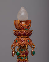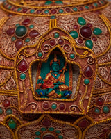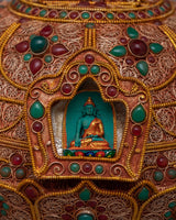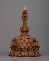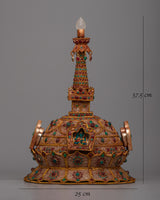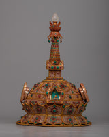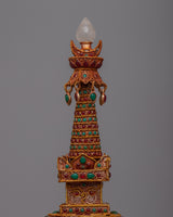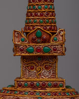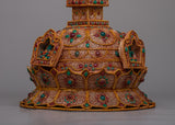 Its surface is adorned with the bright brilliance of Ruby and panna stones, meticulously inlaid to represent spiritual purity and enlightenment. This stupa's elaborate design and beautiful adornments represent the great reverence and dedication of Tibetan culture.