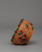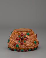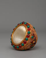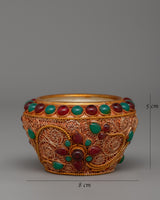 The bowl weighed 0.144 kg and was made with aesthetics and balance in mind. Each gemstone radiates the blessings of protection, clarity, and abundance as it is carefully set into the spinning copper filigree. In Buddhist rituals, golpa bowls generally store offerings such as rice, water, or valuable objects. This bowl creates a sense of calm, awareness, and spiritual depth, whether it is used in everyday routines or as a devotional symbol.