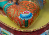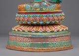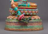 The Tibetan Green Tara Guru Sculpture's exquisite design and intricate detailing make it a true masterpiece. The use of high-quality acrylic paint ensures that the colors remain vibrant and long-lasting. The gold plating and semi-precious stones give the statue a royal and majestic appearance. The positioning of the statue, seated on a moon disc lotus with the palms holding lotus flowers, signifies purity and inner peace. This statue is not just a decorative piece, but a spiritual and emotional representation of peace, purity, and serenity. It can make a perfect addition to any sacred space or as a centerpiece in a peaceful home environment.