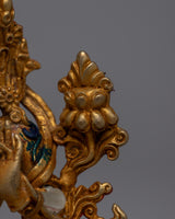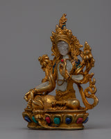 The Tibetan Green Tara Statue honors the respected deity's caring and protective traits. This statue, skillfully crafted on a copper body with a crystal stone composition, captures the essence of Green Tara, the Bodhisattva of compassion and deliverance from suffering. It is adorned with artificial gemstones such as coral and turquoise, reflecting Tara's vivid vitality and spiritual richness.