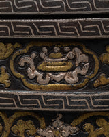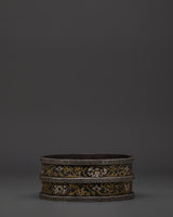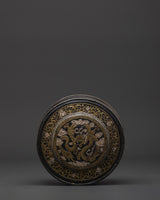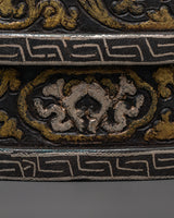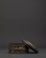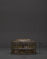 The iron base, crafted using traditional metalworking techniques, is delicately decorated with silver patterns that enhance its elegance and texture. This practical yet streamlined container, weighing 1.52 kg, is both functional and visually appealing. Whether gifted for spiritual purposes or treasured as a decorative piece, this Tibetan box represents cultural legacy and complex craftsmanship.