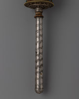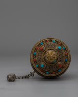 Tibetan Buddhism's extensive practices are presented in this stunning Tibetan Handheld Prayer Wheel, a beautifully established spiritual instrument. This prayer wheel is composed of a copper and 98% silver. Its spiritual and artistic worth is increased by adding and semi-precious stones, such as coral, turquoise, Ethically Sourced Bone. Om Mane Padme Hum is a sacred chant that, when spun, is said to produce blessings and spiritual merit. This mantra is also contained within the prayer wheel.