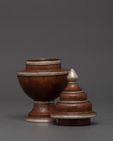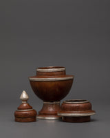 This Tibetan ritual vase or Offering pot is ideal for anyone seeking to enhance their spiritual practices, whether for offerings, blessings, or as a centerpiece in their meditation space. Its oxidized copper surface and detailed brass and silver accents give it a classic, elegant appearance that complements any altar design. This Tibetan Rice pot can used for personal ritual, for spiritual healing, or Buddhist ritual Shrines.