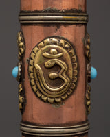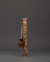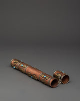 The traditional copper body of this incense holder symbolizes endurance, while the brass embellishments represent protection and spiritual power, adding to its antique charm. The turquoise inlays are typical of Tibetan workmanship, representing serenity and quiet. This holder exemplifies the harmonizing essence of Himalayan workmanship, making it perfect for burning incense during ceremonies or adding a religious touch to your décor. Its exquisite form and cultural significance make it an ideal present for spiritual practitioners and home décor devotees.
