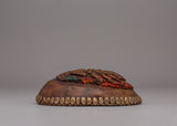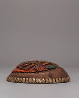 A masterpiece of spiritual creativity, this handcrafted Tibetan Kapala ritual bowl combines resin, white metal, and colorful acrylic paint to produce a visually stunning and profound design. With measurements of 17 cm by 13 cm by 6 cm and a weight of 0.26 kg, this sacred offering bowl is a significant yet portable item that can be used for altar decoration, meditation, or ceremonies. Its unique skull design further enhances its symbolic significance in Tibetan Buddhist ceremonies.