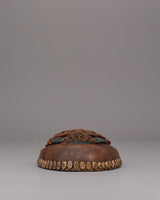 The Kapala is a powerful instrument for spiritual development and is frequently used in Tantric ceremonies to symbolize the transience of life. This exquisitely made bowl has a brightly painted bottom that depicts complex patterns and figures and elaborate skull decorations around the edge.