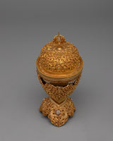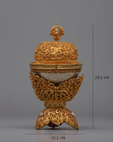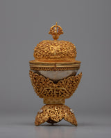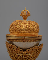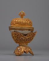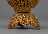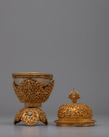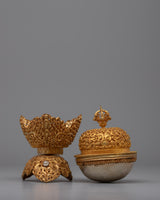 In Tibetan Buddhism, this Tibetan Kapala Skull is highly esteemed as a magnificent ritual object with profound spiritual meaning. This set is 19 cm tall with a base diameter of 17.5 cm. It is crafted with a copper body and completed with beautiful gold plating. Its robust and finely crafted design, together with its weight of 0.324 kg, demonstrates the high level of craftsmanship that went into its production.