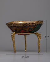 The Tibetan Kapala Skull Cup, displayed on a brass stand, is a potent symbol of change and spiritual awakening. Its 14cm height draws attention and reverence in any spiritual or ceremonial environment. Whether utilized for ritualistic purposes or as a decorative accent, this stunning piece serves as a reminder of the profound spiritual teachings represented in the Tibetan Buddhist tradition.