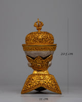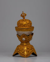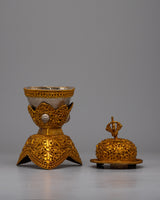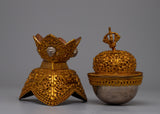 The Tibetan Kapala Skull Cup Set is a beautiful example of Tibetan craftsmanship and spiritual meaning. This set, consisting of two carefully handcrafted pieces, combines pure silver components with a copper body plated in gold to lend depth to the symbolism and visual appeal. The set weighs 1.136 kg, indicating its considerable and superior quality.