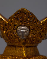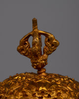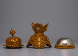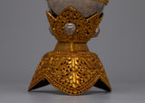 The set of Kapala skull cups is expertly created, showcasing the talented workmanship of Tibetan craftspeople. The pieces of pure silver provide a striking contrast, adding to the overall aesthetic appeal, while the body made of gold-plated copper offers a sumptuous and brilliant finish. These cups have more profound spiritual significance in Tibetan Buddhism than just being ornamental; they are frequently used in rituals to represent the metamorphosis of impure traits into enlightened insight.