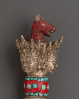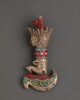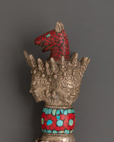 This Tibetan Kartika Flaying Knife has coral and turquoise inlays that represent energy, protection, and knowledge, adding to its spiritual and artistic value. This magnificent artwork, which has traditionally been utilized in spiritual purifying rituals, is a must-have for Tibetan Buddhist ceremonies. Whether you collect rare religious items or want to develop your spiritual practices, this handcrafted knife is a must-have. The brass and silver-plated materials ensure durability and a timeless look that will last generations.