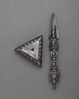 Ritual tools are vital equipment of Tibetan Vajrayana Buddhism practice, meant to dispel misconceptions obstructing enlightenment. The phurba (Sanskrit: Kila) blade seen here was created to symbolically swallow the three poisons that obstruct spiritual progress: ignorance, greed, and illusion. The Phurba is the physical manifestation of the Vajrakila Buddha, who has the ability to destroy all evil on the earth. Its ceremonial usage is first recorded in the Vajrakilaya Tantra, an eighth-century or older Vajrayana work.