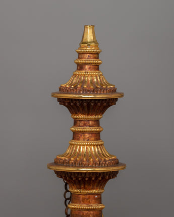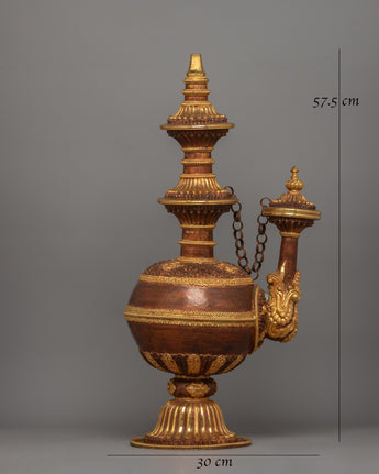 This handcrafted Tibetan Kundika, 57.5cm tall and 30cm broad, is a sacred Buddhist ritual vase used to deliver pure water, blessings, and purification ceremonies. It is made of oxidized copper and has a gorgeous gold-plated finish. This stunning Kundika weighs 4.388kg and is an essential ceremonial relic for altars, temples, and spiritual settings.