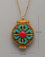 This magnificent handcrafted Tibetan locket is an excellent combination of traditional workmanship and spiritual meaning. The locket, made of copper and tastefully electro-gold-plated, features exquisite filigree elements accented with bright turquoise and coral (Artificial stones). The circular pattern is ageless and symbolic in Tibetan culture, expressing peace and balance. Whether worn as a display item or treasured for its spiritual value, this locket exemplifies Himalayan workmanship.