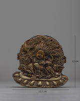 The Tibetan Mahakala Ghau Box is a perfectly created remains which reflects Tibetan Buddhism's rich heritage of culture and spiritual significance. This magnificent box, made with an exclusive combination of 50% silver and 14-carat gold, is 13 cm in height and 13.5 cm in width. Its sparkling surface and intricate decorations reflect the brilliance of traditional Tibetan handicraft, which produces a magnificent piece that is both attractive and useful. The image of Mahakala, a powerful protector deity, gives spiritual depth, sacrificing blessings and protection to people who embrace it.