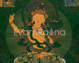 This hand-painted thangka features the Tibetan Manjushri, the Bodhisattva of Wisdom, surrounded by revered deities Shakyamuni Buddha, Medicine Buddha, and Namtoshe. Each figure embodies spiritual qualities: wisdom, healing, and wealth protection. The artwork is on a lush green canvas, accentuated with genuine 24K gold. As the deities' bodies and key symbolic elements are rendered in vibrant acrylic colors, the rest of the composition gleams with golden intricacy. The painting exemplifies both artistic mastery and spiritual devotion. Skilled Nepali artisans render every detail using traditional techniques, Thangkaing a deep reverence for Tibetan iconography and artistic heritage.