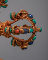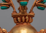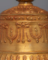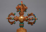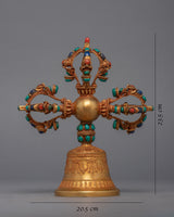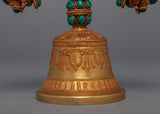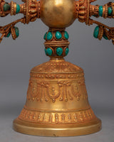 The Tibetan Meditation Bell With Vajra Handle is a copper body with 24K gold plated with Gemstones attached to them. The vajra is placed at the top of the bell. The gemstones are placed on the vajra only.