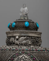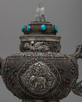 Experience the luxurious allure of our silver-plated Tibetan Ritual Kettle. This exquisite piece, handcrafted on a copper body and lavishly silver plated, is more than just a teapot; it's a work of art. It is adorned with sparkling gemstones and brings the mystical charm of Tibetan traditions directly to your table.