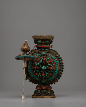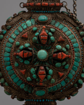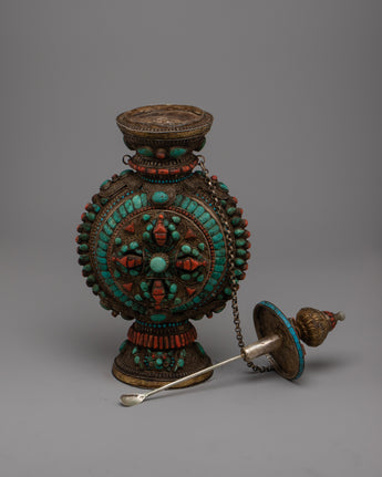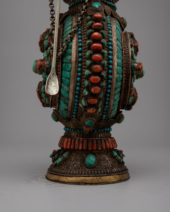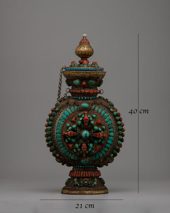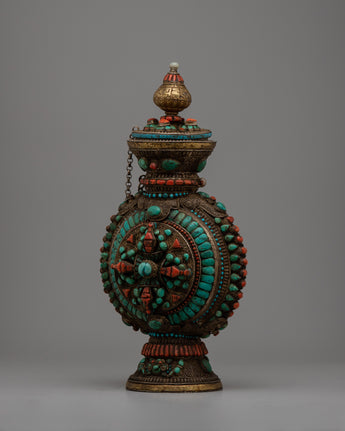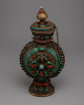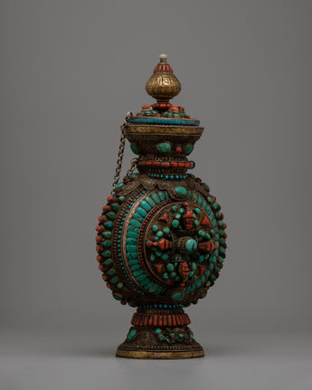 Crafted with great care by hand from pure silver and copper, the Tibetan Silver Snuff Bottle is an astounding 40 cm tall. Exquisite inlays of priceless stones, including lapis lazuli, turquoise, and coral, are shown. These stones each have important symbolic meanings: lapis lazuli represents wisdom, turquoise represents serenity, and coral represents protection. This snuff bottle, which reflects the rich cultural legacy of Tibet, is both practical and aesthetically pleasing. It would make an excellent addition to any collection and a tasteful display piece for your home or place of business.