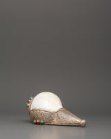 This Tibetan handmade spiritual conch shell is a treasured ceremonial tool to enhance spiritual practices and bring benefits. Standing 9 cm in height and 21 cm in breadth, this conch is a stunning combination of pure silver, coral, and turquoise stones. Its meticulous craftsmanship and spiritual significance make it an effective instrument for Tibetan Buddhist rituals. Conchs like this one are used to cleanse negative energy and create positive spiritual vibrations, improving the ambiance of any sacred space.