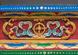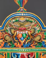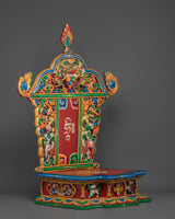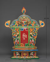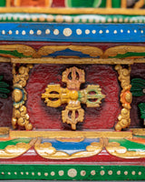 This hand-carved Buddhist throne is ideal for displaying sculptures of the Buddha, Tara, Guru Rinpoche, or other deities and serves as a powerful focal point in any holy space. The harmonious combination of brilliant colors and intricate carvings evokes the traditional Tibetan spirit, culminating in a spiritual and artistic masterpiece. This throne is not only an altar ornament, but also a piece of devotional art that will improve your practice and spiritual connection.