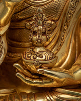 This statue, weighing 10.94 kg, is a monument to the painstaking craftsmanship of our talented Nepalese artisans. It is an amazing item expressing ageless spiritual wisdom, made of a sturdy copper body, 24k gold plating, and acrylic paints. This Guru Rinpoche statue is more than just a decorative item; it is a gateway to profound contemplation and a peaceful meditation experience.