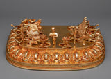 This imposing sculpture is painstakingly carved from copper and ornately coated in 24K gold, which highlights its complex details and fiery vitality. The gold and acrylic paintings accentuate the vibrant expressions and many limbs, with each detail precisely realized to portray Vajrabhairava's terrible character as a guardian and remover of impediments on the way to enlightenment. As the wrathful form of Manjushri, the Bodhisattva of Wisdom, Vajrabhairava represents the turning of rage and violence into forceful, enlightened action. He is shown with a buffalo head, several arms carrying various sacred items, and astride a slew of vanquished figures, symbolizing the triumph of good over evil.