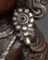 This exquisite Vajrasattva statue is a true masterpiece, meticulously hand-carved by skilled artisans in our studio using traditional Himalayan carving techniques passed down from generation to generation in Nepal. The Bodhisattva is depicted in his customary placid and tranquil demeanor, seated on a moon disc lotus seat and in the lotus position, exuding a sense of calm and serenity. In his right hand, he holds a vajra, a symbol of the impermanence and constancy of reality, while in his left hand, he holds a bell, representing emptiness and the sound of wisdom. The silver plating on the statue's copper body gives it a brilliant luster, catching the light and adding to its radiance.
