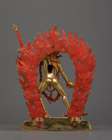 Wearing a necklace made of skulls, she represents control over death and the negative forces that negatively impact spiritual development. The Flaming Halo behind her reflects her fierce compassion and represents the destructive power of wisdom, which burns away delusions and obstacles on the path to enlightenment. Vajrayogini is regarded as the Queen of Dakinis, or feminine knowledge beings, and is known for her intense compassion, which aids practitioners in overcoming duality and realizing the essence of reality. For tantric Buddhists, this beautifully carved statue is a focal point that embodies the transformational power of Vajrayogini in any holy location.
