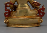 Wealth God Dzambhala Statue is a work of divine artistry that shows the way to financial satisfaction. Experience the blessings of success. This statue, which was carefully constructed with every detail in mind, is 6.7 inches tall and 5.1 inches broad at the base. This statue precisely applies gold and acrylic paints and is crafted from the best materials, such as copper gilded in 24K gold. It perfectly captures the grandeur and splendor of the Wealth God Dzambhala. emitting a wealth and abundance aura and emanating the heavenly energy of success and fortune.