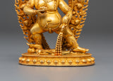 The Wealth Guardian Black Dzambhala Statue is handcrafted with meticulous features, highlighting the deity's dominating presence, seated position, and traditional symbolic aspects. The gold plating adds to the spiritual aura, while the copper body provides a rich, earthy tone that showcases the sculpture's intricate design. Every detail of the statue, from Dzambhala's facial expression to the decorative motifs, represents riches, protection, and spiritual advice, making it an important addition to any spiritual collection or sacred area. This Wealth Guardian Black Dzambhala Statue is a spiritual instrument as well as a decorative piece, making it ideal for practitioners looking to attract wealth, protection, and abundance.