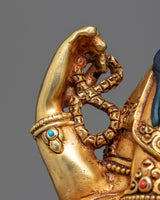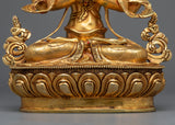With this stunning copper statue that has been 24K gold-gilded, Avalokistesvara's limitless compassion may be brought into your home or other holy areas. This amazing work, which stands 14.5" tall, tapers to 9.8" at the base, and weighs 3.72 kg, displays the prodigious talent of our Vajrayana craftsmen.