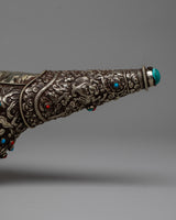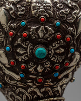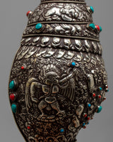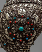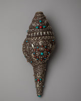 Presenting our exquisite Wheel of Life Conch Shell, which is expertly fashioned on white metal and encrusted with the alluring Wheel of Life art. This holy object's curves are full of spiritual meaning, providing a concrete illustration of life's never-ending cycle.