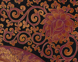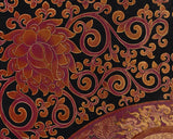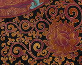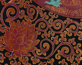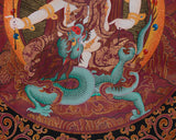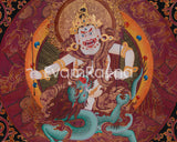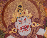 Dzambhala is depicted seated, with a forceful, ferocious presence. A dazzling circle of flame in the background represents his dynamic and transformational abilities. His intense, demanding, yet compassionate visage embodies his capacity to expel negative energy and provide material prosperity. The blazing flames surrounding him stand for his ability to overcome challenges and the burning energy required to cleanse bad karma. His lavish presence and relationship with wealth are further highlighted by the elaborate patterns surrounding him, which are accentuated by golden tones. The artwork's formidable dragon, which represents strength and the realization of Dzambhala's ability to provide riches, gives the setting a dynamic and protective energy. Add this Thangka to your house or place of devotion right now to welcome karmic healing and divine abundance.